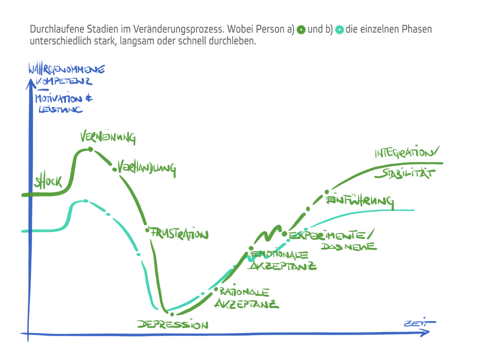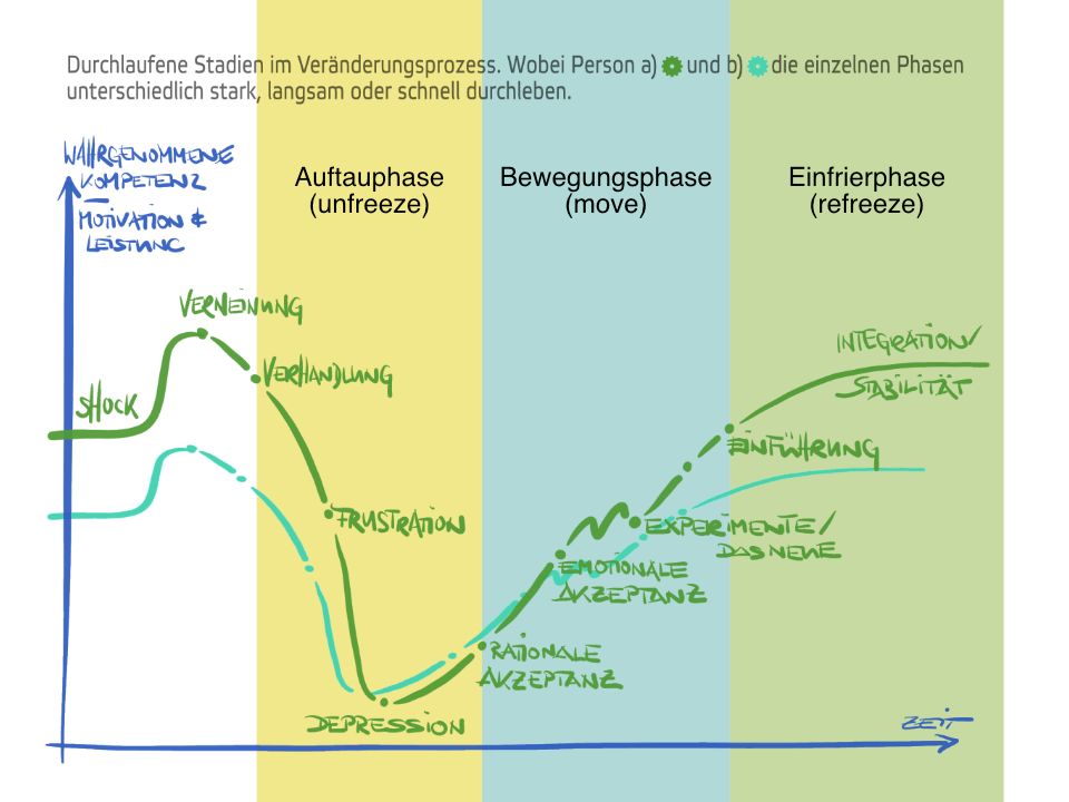 Bereits in den 1960er Jahren wurde von der schweizerisch-US-amerikanischen Psychiaterin Elisabeth Kübler-Ross im Zusammenhang mit Trauerarbeit die Veränderungskurve entwickelt. Kübler-Ross kam zu der Erkenntnis, dass alle Menschen in starken, abrupten Veränderungen die gleichen emotionalen Phasen durchlaufen. Die Kurve bildet modellhaft die verschiedenen emotionalen Stadien des Trauerprozesses ab. Inzwischen wird die Kurve auch für Wandelprozese in Organisationen genutzt, um persönliche Reaktionen von Menschen auf signifikante Veränderungen begreifbar zu machen. Abb. 1 zeigt den Verlauf der Kurve, Abb. 2 die Phasen der Kurve in Kombination mit den 3 Phasen nach Lewin. In der Begleitung und Führung von Veränderung muss deshalb berücksichtigt werden, dass Menschen, in ihrer Individualität, diesen Prozess unterschiedlich stark erleben und in jeweils ihrer eigenen Zeit durchlaufen. Ein "one size fits all" Management kann es also nicht geben.